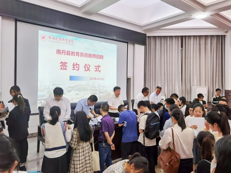 4月28日,南丹县教育局、人社局、县委编办及14家中小学幼儿园到学校开展教师专场招聘会,此次招聘活动分四步进行,分别是宣讲、现场报名、面试、签约。参加此次活动毕业生300余人,其中213人进入面试环节,最终面试合格105人,现场签约97人。