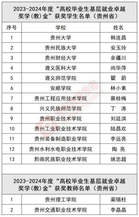 近日,教育部公布2023-2024 年度“高校毕业生基层就业卓越奖学(教)金”获奖人选名单,贵州13名学生、2名教师上榜。一起来看——