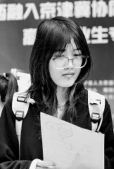 朝阳师范学院大学生在辽宁省朝阳市求职招聘会上咨询。