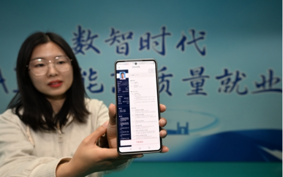 在天津外国语大学,工作人员展示AI生成的求职简历。新华社发