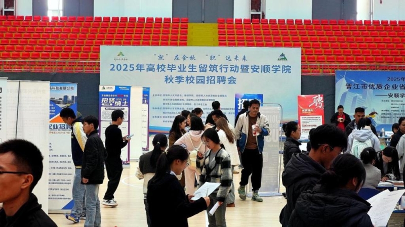 2025年10月28日,安顺学院隆重举办了主题为“‘就’在金秋 ‘职’达未来”的2025年高校毕业生留筑行动暨安顺学院秋季校园招聘会。本次招聘会由贵阳市人大常委会、安顺学院、安顺市人力资源和社会保障局、南京市人力资源和社会保障局、晋江市人力资源和社会保障局联合主办。活动当天,贵阳市人大常委会党组成员、副主任王启云,安顺学院院长曾丽,安顺学院党委常委、副校长孙向阳出席招聘会现场,并与用人企业、求职学生深入交流,详细了解企业招聘情况和学生应聘需求。